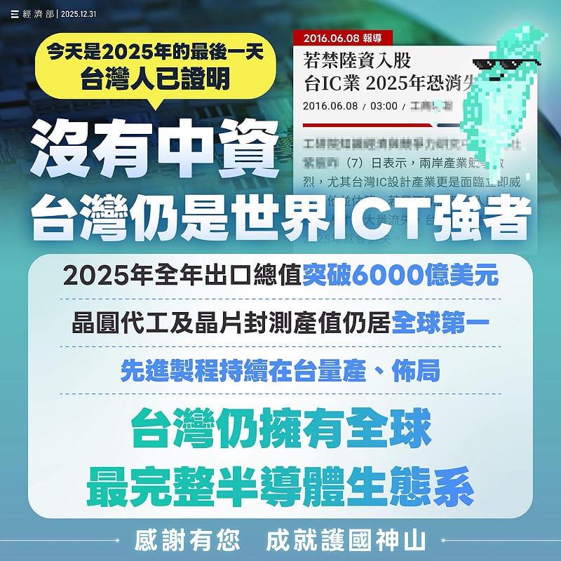 今天是 2025 年的最後一天,經濟部同步在臉書、threads等平台發文表示,台灣人已經用實力證明,台灣半導體產業不僅沒有消失,且經濟部長龔明鑫也向大家報告,台灣的半導體業如冠冕上明珠,要將量能布局全球,持續穩站全球供應鏈最前線,成為世界不可或缺的「矽盾」!