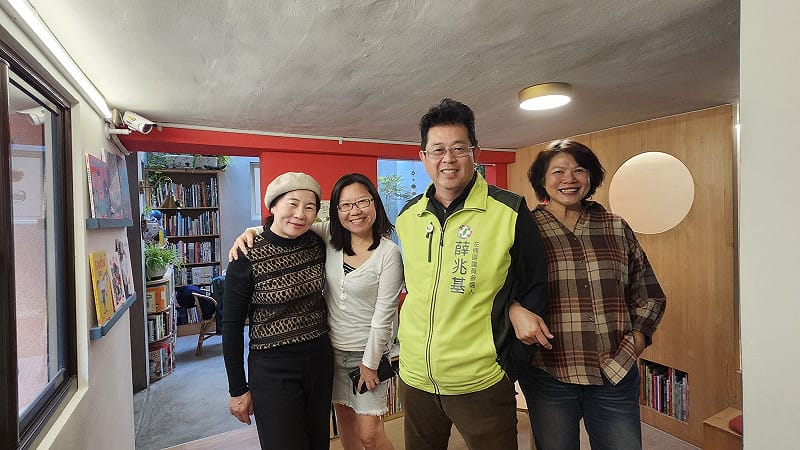 薛兆基(右一)認為不少獨立書店早已超越單純賣書的角色,成為社區共讀、親子教育、青年思辨與世代對話的重要空間。 圖:薛兆基競選總部/提供