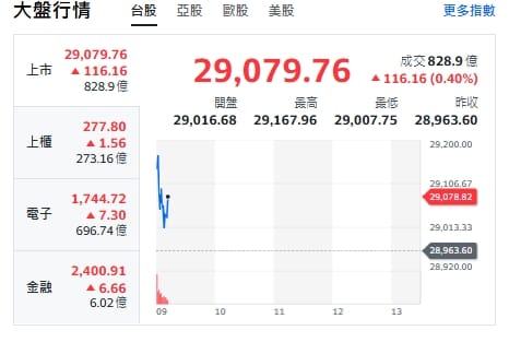 台股今天(2日)開紅、衝漲116點,最高來到29167點。上櫃、電子與金融類股全揚升!重要電子權值股,約9點15分前,台積電漲5元、來到1555元。鴻海平盤、維持230.5元。廣達跌0.5元、來到271.5元。聯發科漲15元、來到1445元。台達電漲12元、來到975元。