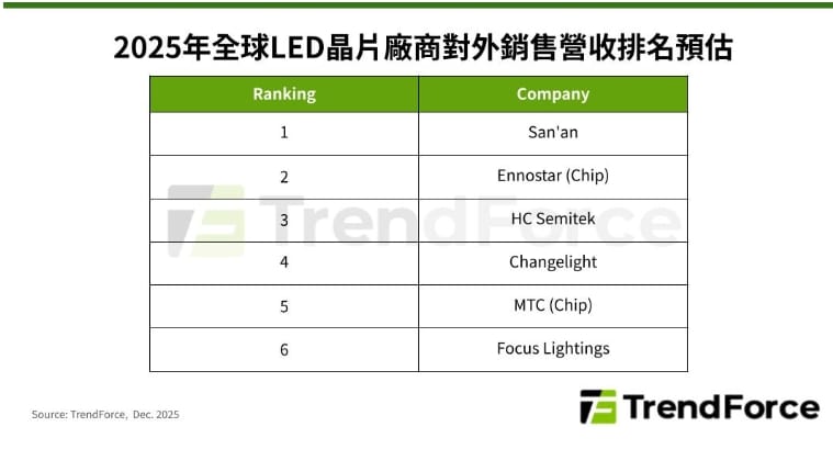 TrendForce預估,2025年全球LED晶片對外銷售市場總產值為28.41億美元,兆元光電排名第九,LED晶片業務營收主要來自照明、背光和Mini LED顯示屏應用。