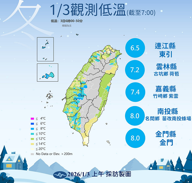 根據氣象署資料,全國平地共有93個測站最低溫不到10度,前3名為東引測站6.5度、馬祖測站6.7度、北竿測站7.2度,至於本島最冷的測站在雲林古坑荷苞,和北竿一樣都是7.2度,其他地方嘉義縣竹崎紫雲測站7.4度,南投名間苗改南投蜂場測站為8度。