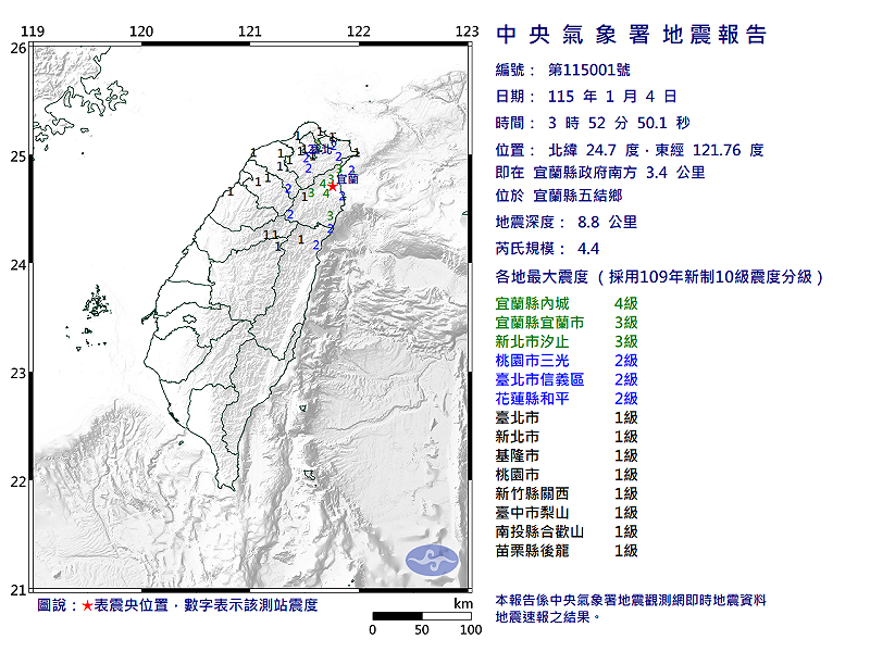 根據中央氣象署資料,01/04-03:52發生芮氏規模4.4有感地震 ,震央位於北緯 24.7度、東經121.76度,地震深度為8.8公里 ,相對位置在宜蘭縣政府南方 3.4 公里 (位於宜蘭縣五結鄉)。各地最大地震度級: