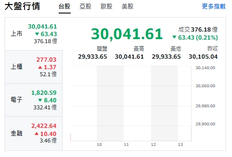 台股今天(6日)開黑小跌63點,最低29933點,暫失守30000點,重要電子權值股F4,約9點10分前,台積電跌15元、來到1655元。鴻海漲3.5元、來到238元。聯發科漲5元、來到1520元 。台達電跌10元、來到1000元 。廣達跌2元、276元 。