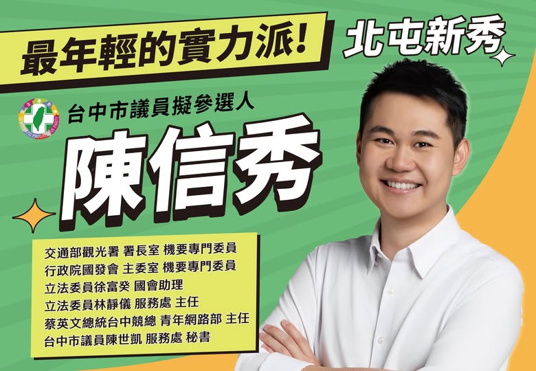 台中市人口最多的北屯區下屆市議員選舉再增一名新人,民進黨新潮流決定推出屬於交通部長陳世凱子嫡系的陳信秀參選,民進黨過去在北屯區最佳成績曾有三席,但近兩屆新系推出的蔡雅玲接連敗北,陳信秀最近在臉書成立粉專,正式宣布參選。