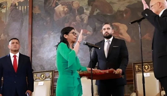 委內瑞拉副總統德爾西·羅德里格斯當地時間 5 日宣誓就任委內瑞拉代總統。從現場影片來看,主持宣誓就職儀式的人員,除了委內瑞拉國民議會議長豪爾赫·羅德里格斯外,還有委內瑞拉總統馬杜洛的兒子、國民議會議員尼古拉斯·馬杜洛·格拉。