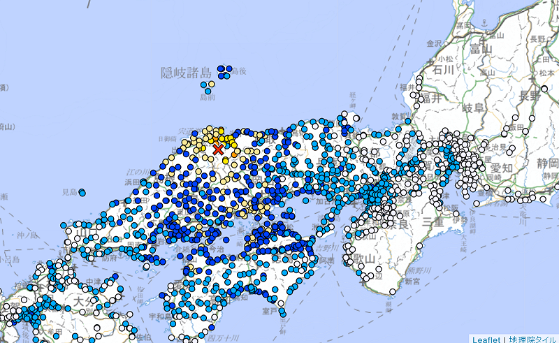 根據NHK報導,這起地震震央位於島根縣東部,造成了長時間的震動,島根縣松江市、安來市以及鳥取縣境港市、日野町、江府町測得最大震度5強。
