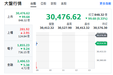 台股今天(7日)漲99點,最低來到30412點。上櫃揚升。電子與金融類股下挫。約9點10分前,重要電子權值股,台積電跌25元、來到1680元。廣達漲0.5元、來到282.5元。台達電漲15元、來到1065元。鴻海漲2元、來到238元。聯發科平盤、維持1485元。