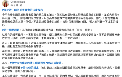 郭志南點出,陳菁徽所指的包括「媒體報導曝光後,相關懲戒程序才『被迫』啟動?」以及「何建忠的社工師證照至今仍未被撤銷?」,這兩個問題應該回到法律規定來看,而不能用政治語言包裝。