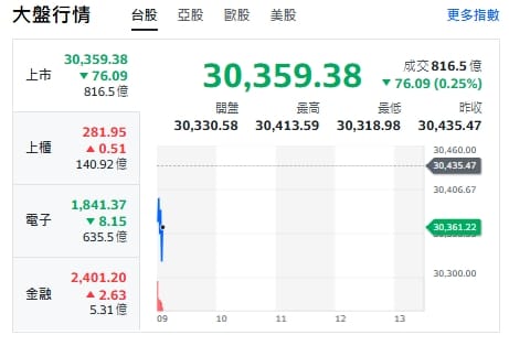 台股今天(8日)開黑小跌76點,最低來到30318點。重要電子權值股,約9點10分前,台積電跌15分、來到1660元。鴻海跌3元、來到235.5元。台達電平盤維持1030元。廣達跌3.5元、來到278.5元。聯發科跌5元、來到1485元。