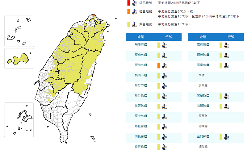中央氣象署今日上午針對17縣市發布低溫特報。其中基隆市、台北市、桃園市、新竹市、新竹縣、苗栗縣、台中市、彰化縣、南投縣、雲林縣、嘉義市、嘉義縣、台南市、宜蘭縣、花蓮縣、金門縣有10度以下氣溫發生的機率。另新北市石門區達低溫橙色燈號(寒冷),體感溫度達8至9度低溫。