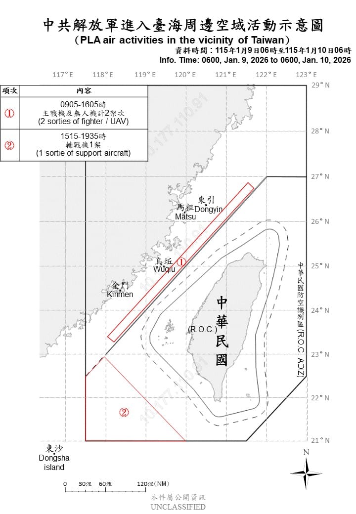 國防部指出,自昨天上午6時至今天上午6時,偵獲3架次共機,其中1架進入西南空域,以及6艘共艦,總計共軍9機艦持續在台海周邊活動,國軍嚴密監控與應處。