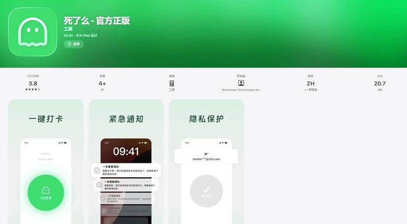 由月境(鄭州)技術服務有限公司開發的「死了麼」,標榜是為獨居族群打造的輕量化安全工具,目前僅在中國版蘋果App Store上架,安卓系統尚未推出。剛上市時供免費下載,如今要人民幣8元才能下載。