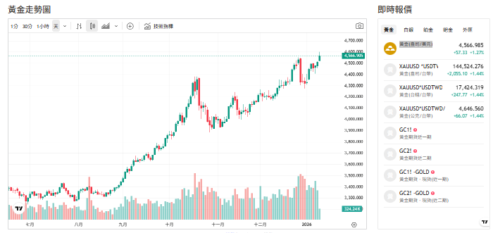 市場關注美國與委內瑞拉、伊朗、甚至格陵蘭,地緣政治紛爭緊張情勢不減,避險資金支撐金價止穩於5日均線,但短線美元指數反彈近98.9,同時市場靜待美國最新非農數據,與最高法院即將對美國川普政府關稅合法性作出裁決,觀望性買盤使金價呈現上有壓下有撐,4,450-4,475美元區間寬幅震盪。截至今天(12日)下午1點前黃金交易價來到4566(盎司/美元)。