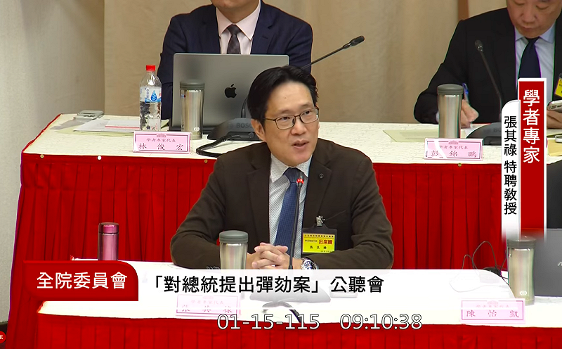 立法院今(15)日召開全院委員會,就「總統彈劾案」舉行公聽會,國立中山大學政治經濟學系特聘教授、前立委張其祿作為首位發言者指出,這場彈劾爭議的核心,並非單一政策或政黨衝突,而是台灣在「雙少數政府」結構下,憲政體制出現制度性失靈,甚至已演變為民主運作的結構性危機。