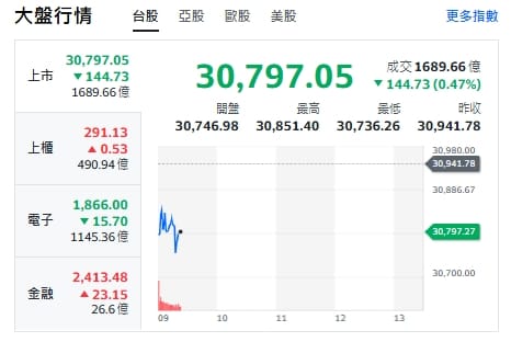 台股今天(15日)開黑跌逾百點,最低30742點,上櫃與金融類股揚升。電子走跌。重要電子權值股,約9點20分前,台積電跌20元、來到1690元。台達電跌10元、來到1050元。鴻海跌2.5元、來到232元。廣達跌4.5元、來到281.5元。聯發科跌30元、來到1470元。