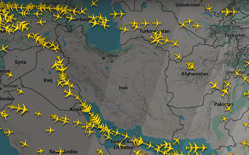 由Flightradar24的航班追蹤動態圖可發現,伊朗上空幾乎呈現淨空狀態。