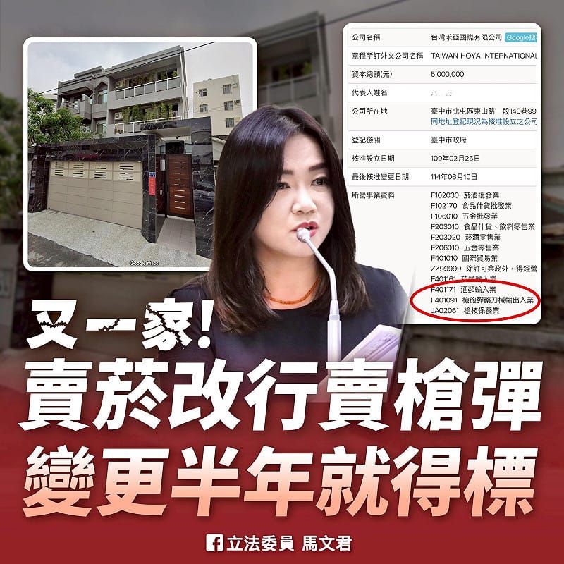 她進一步揭露,得標廠商為「台灣禾亞國際有限公司」,公司於 109 年成立,設址於台中,過去主要營業項目為菸酒、食品及五金零售批發。依據經濟部商工登記網與台灣公司網資料顯示,該公司在此之前並無任何政府標案投標紀錄,卻於去年 6 月變更營業項目,新增槍砲彈藥輸出入及槍枝保養業務,不到半年即投標並得標軍備局 9 公厘手槍彈採購案。