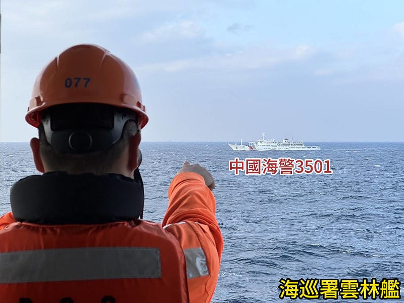 海巡署東南沙分署14日0514時偵獲中國海警「3501」位於我國東沙島限制水域外,依其航向研判,可能航入我國限制水域,海巡署立即調派「雲林艦」及「高雄艦」,以二對一方式,全程監控強勢驅離。