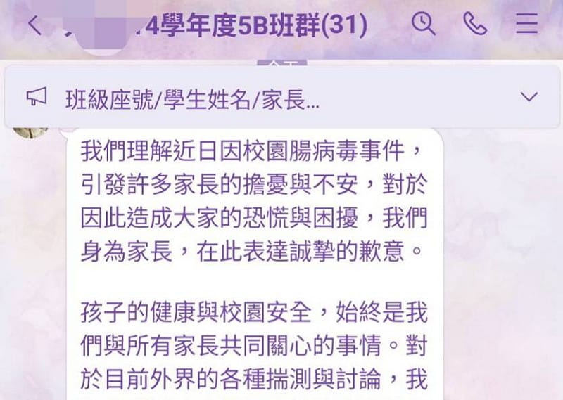 「我們已全力配合學校與相關單位的所有防疫與後續措施,也願意持續遵循校方及衛生單位的指引,共同守護孩子們的健康。我們之前不積極回應,是因為我們的職業特殊,不方便以個人的身分在群組回應。但若因此造成大家的誤會,我們也致上最誠摯的歉意,但我們一直有跟學校及老師聯繫,掌握最新的疫情發展。」