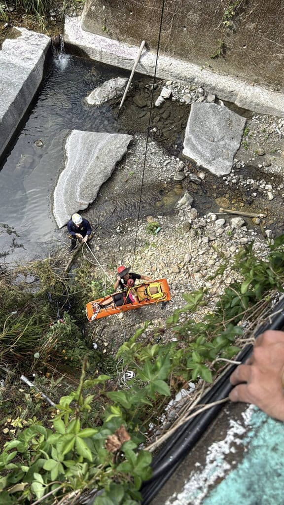 消防隊員評估無法徒步接觸傷患,於是在橋上架設下降繩,2名消防隊員垂降進入河谷先行接觸評估傷患,橋上人員同時架設拖拉系統,等到傷患處置及固定完備後,再用拖拉系統將傷患往上拉。