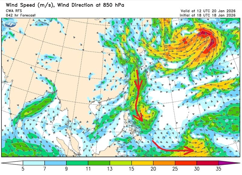 這週海面上同時有颱風和冷高壓,看似完全相法的兩股氣壓其實有所關聯。鄭明典今日貼出,明晚8時的「850百帕風場預報」指出,大低壓帶的產生和反聖嬰現象有關,也有利東北季風增強,可以在明晚8時這個時間點,同時看到北風和颱風環流結合起來,這是因為高壓來的空氣傾向於流入低壓區,颱風是低壓,低壓有上升氣流,可以持續接納高壓流過來的氣流。