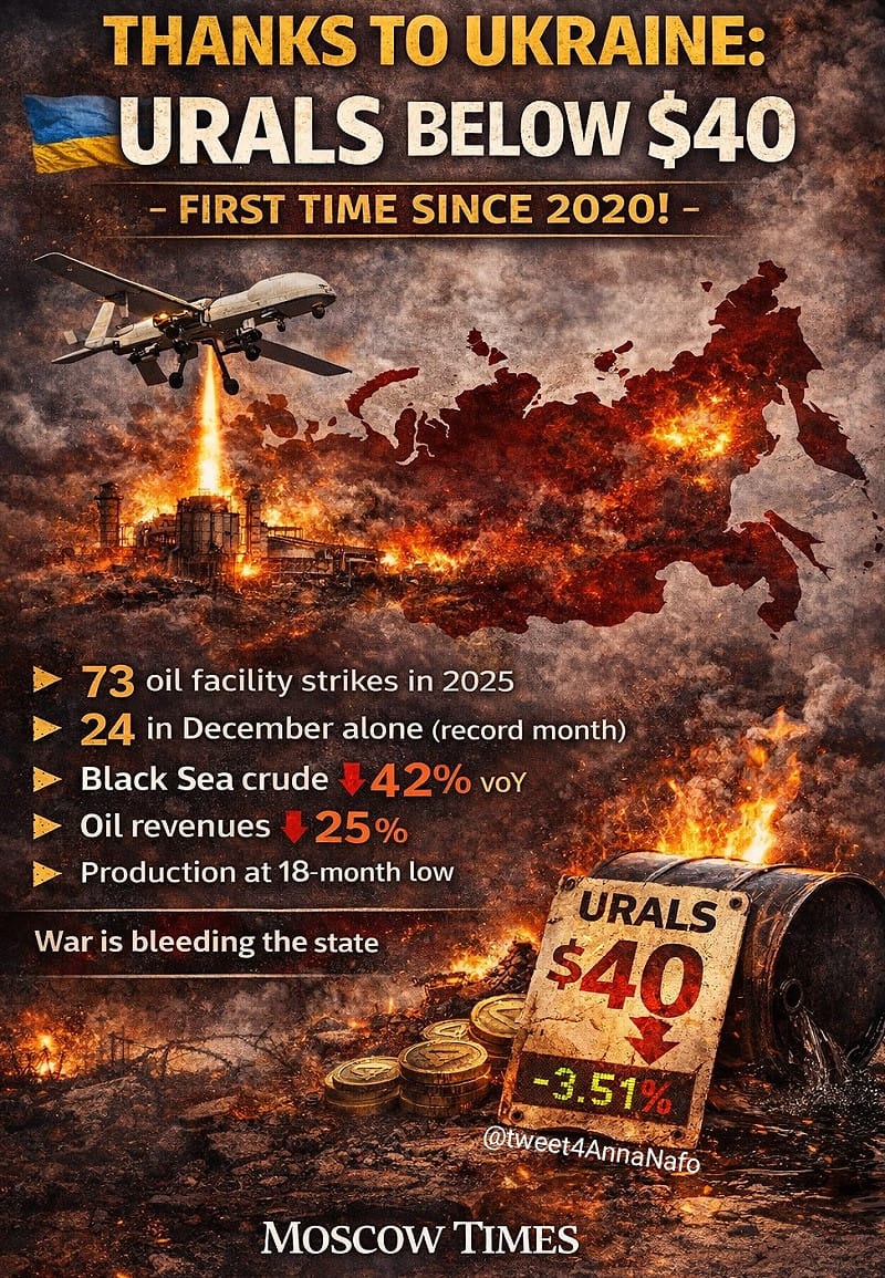 據《莫斯科時報》報導,烏拉爾原油 2020 年以來首次跌破 40 美元,報導推測可能是受烏克蘭罷工影響。X 《Anna Komsa》消息指出,能源收入銳減下,俄羅斯政府被迫以舉債因應,去年化石燃料出口收入年減 24% ,自 2021 年以來公共債務幾乎倍增,從 21 兆盧布攀升至 39 兆盧布。2026 年預算中,償債支出已占 8.8% ,甚至超過醫療與教育支出總和。