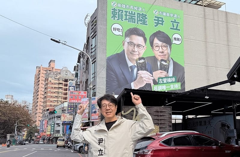高雄市長民進黨初選落幕,地方選戰熱度迅速升溫,左營、楠梓市議員參選人尹立搶頭香,推出首面與通過高雄市長初選的立委賴瑞隆同框的看板,一人拿一捲海苔飯捲,不走制式嚴肅路線,選擇以幽默巧思,走出截然不同的風格。