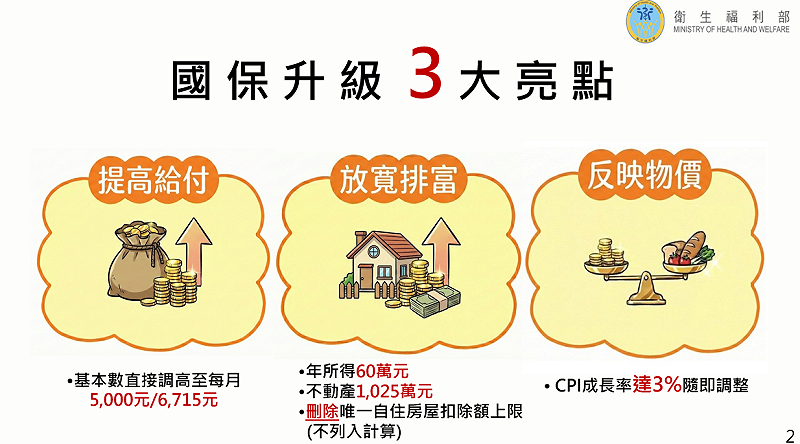 行政院會預計今(22)日通過《國民年金法》部分條文修正草案,根據衛生福利部的規劃,此次修法重點在於提高國民年金給付水準(基本數直接調高至每月5,000元/6,715元)、放寬排富門檻並落實居住正義,同時建立即時反映消費者物價指數(CPI)的調整機制(2年內CPI只要成長達3%,隨即調整)共三大重點,預估政府每年將投入約860億元,約176萬人可望受惠。