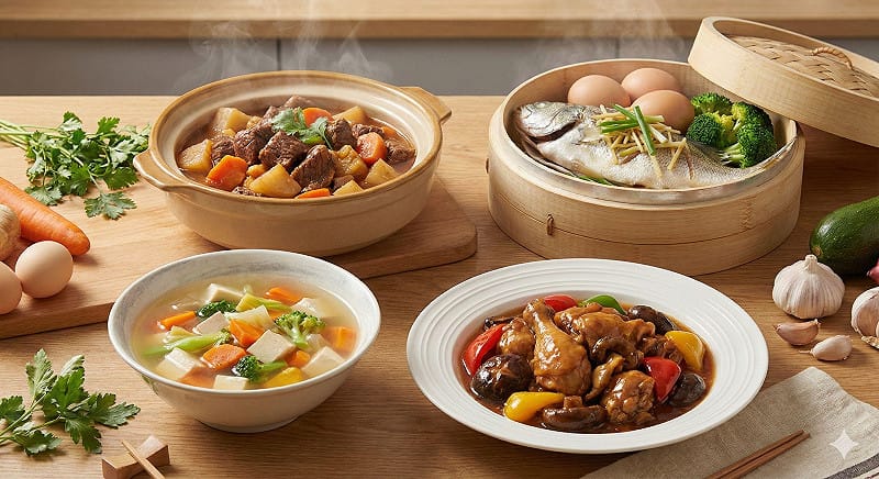 3. 第三是「蒸」,這是最能保留營養的方式,適合魚、蛋與青菜,幾乎不產生油脂氧化,對心血管最友善。4. 最後是「燴」,透過少油慢收讓肉類與蔬菜風味融合,用油量可控且不易進食過量。