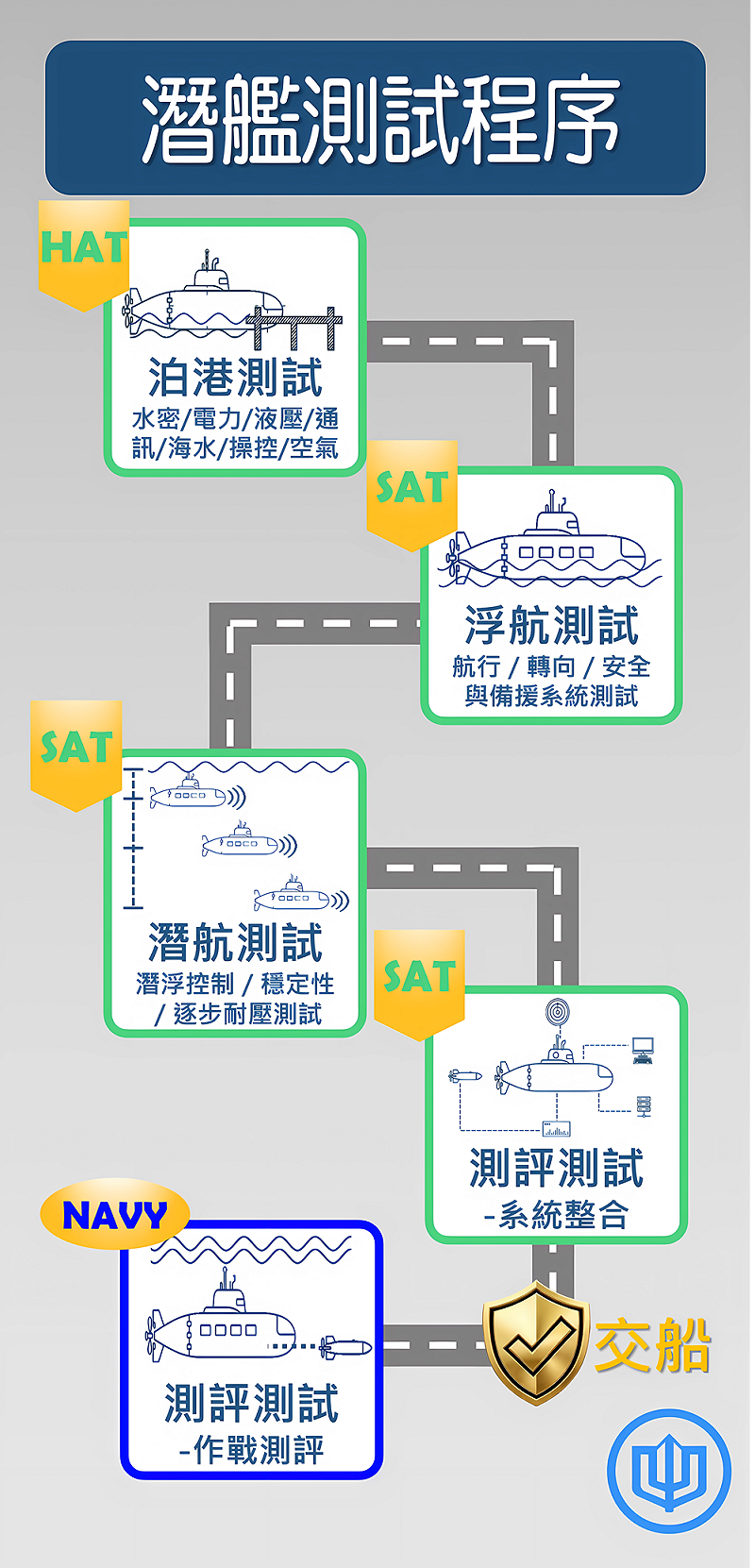 潛艦測試主要分為三大階段:碼頭測試(Harbor Acceptance Test, HAT,或稱泊港測試、港內測試)、出海測試(Sea Acceptance Test, SAT,或稱海上測試),以及測評測試(Tactical Evaluation Test),包括船廠技術測評與交艦後的作戰測評(戰術測評)。其中差異最大的是出海測試:潛艦下潛後即失去水面艦艇的預留浮力,需封閉所有外部通道,並在船殼水密邊界與通海系統上逐步承受巨大海水壓力,因此港內測試成為出海前極為重要且費時的安全準備與守護。