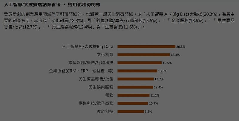 新創創業關鍵字為人工智慧/大數據:人工智慧與大數據連續四年穩坐關鍵字榜首,AI已成為推動創新創業的主要驅動力。