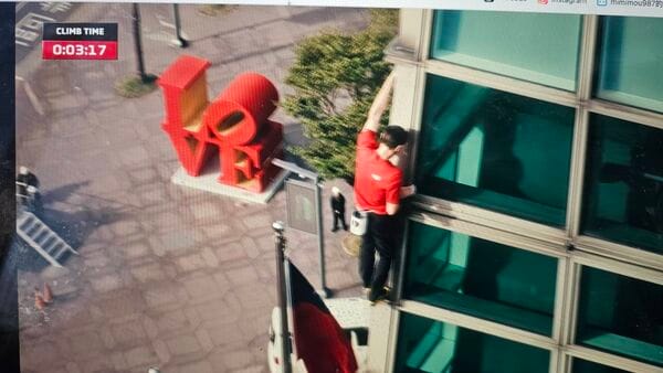 不過,就在霍諾德爬升至約20層樓高度時,他突然在一處節點停了下來,停在半空中。由於這是無繩索的「Free Solo」,任何停頓都可能意味著體力流失或遇到困難。直播主持人見狀語氣瞬間緊張,沒想到下一秒,只見霍諾德騰出一隻手,淡定伸向身後,原來他只是要調整音樂。