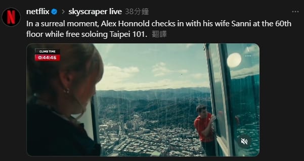 艾力克斯霍諾德現身60樓,隔窗為他加油打氣。 圖/截取自Netflix US netflix