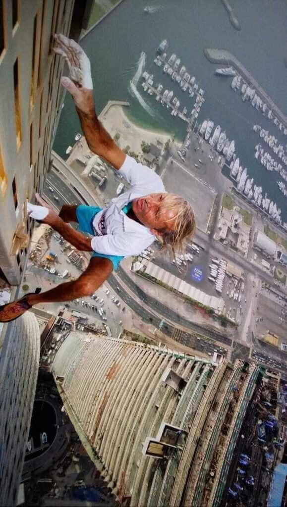當天起風又下雨,且大樓尚未正式落成,許多表面仍貼著防刮傷的覆油塑膠膜,加上他的手肘在出發前9天因傷縫了十多針,腫成平時1.5倍大,更增加了攀爬難度,只能在使用繩索吊帶的情況下完成創舉。