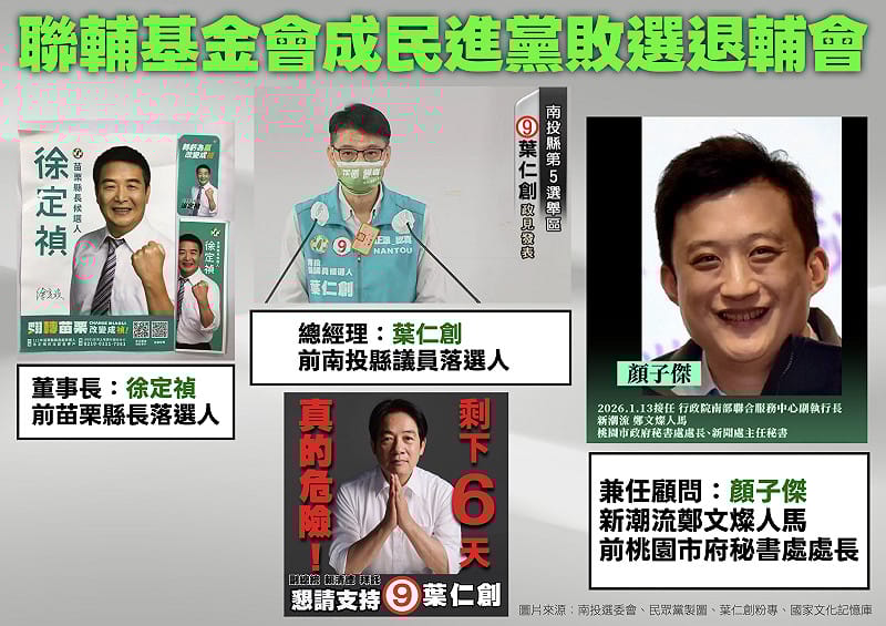 王鴻薇表示,中小企業聯合輔導基金會(以下稱聯輔基金會),已成為民進黨人事酬庸的溫床,從董事長、總經理到顧問,都是民進黨的民代落選人,酬庸毫無專業可言,現任董事長徐定禎是民進黨苗栗縣長落選人,照理說應該是專業人選的總經理葉仁創是南投議員落選人,兼任顧問則是鄭文燦人馬、桃園市府前秘書處長顏子傑,根本淪為民進黨的「敗選退輔會」。