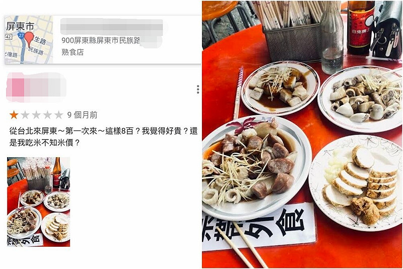 民眾於社群平台發文,轉貼自己9個月前留下的Google一星評論,在屏東夜市攤位用餐共點4盤黑白切,有魚蛋、粉腸、大腸、生腸、豬牙齦、鯊魚煙等,「從台北來屏東,第一次來,這樣800?我覺得好貴?」