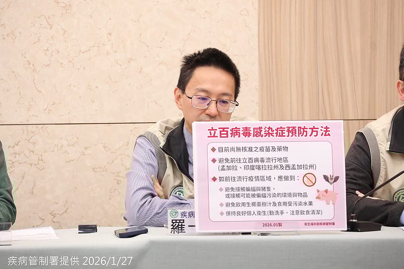 至於印度疫情原先集中在南部喀拉拉州,多源於接觸受污染水果或院內感染,但近期東部的西孟加拉州也出現病例,截至1月25日已累積報告5例確定病例,其中2例病況嚴重。疾管署指出,世界衛生組織(WHO)資料顯示,其致死率約在40%至75%之間,雖然全球風險仍屬低度,但孟加拉與印度鄰近地區仍有持續發生風險。