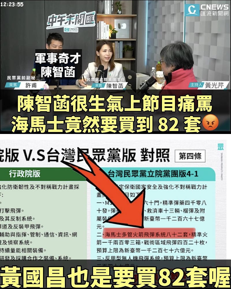 粉專「夜柯魔悍將」27日發文提及,陳智菡14日接受專訪時才說,「海馬士火箭系統,竟然要買到 82 套!82 套這是一個非常驚人的數字」,結果「憨包小偷黃國昌」民眾黨自提版本,海馬士多管火箭飛彈系統(HIMARS)也要買82套,預算上限為1276億元。