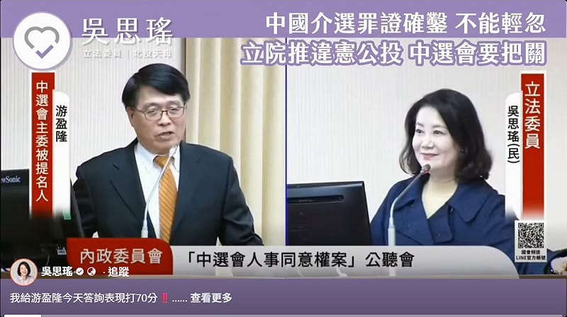 立法院內政、司法及法制委員會今(28日)聯席審查中選會人事案,民進黨立委吳思瑤以藍白推動不在籍投票、中共介選及民調禁制期等議題,質詢主委被提名人游盈隆,最終給予游盈隆答詢表現「70分」。其中,有關游盈隆對中共介選「感覺嚴重但證據不足」的說法,吳思瑤舉法務部偵辦117件境外勢力介選案等證據,直批是「掩耳盜鈴」,呼籲社會嚴格監督中選會守法合憲。