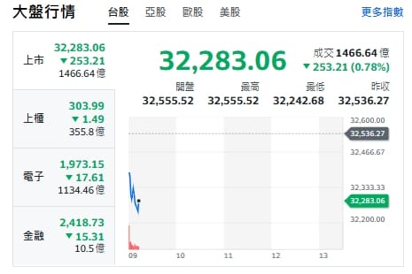 台股今天(30日)開黑走跌、跌逾280點,最低來到32242點。上櫃、電子與金融類股全走跌。重要電子權值股,約9點20分前,台積電跌15元、來到1790元。廣達跌2元、來到281元。台達電跌20元、來到1235元。鴻海跌2.5元、來到221.5元。聯發科跌20元、來到1760元。