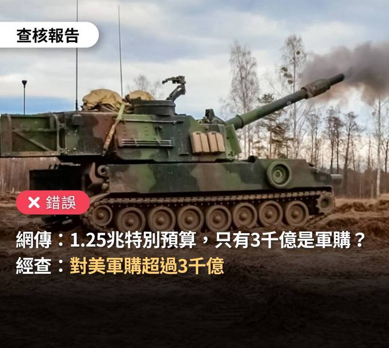事實查核中心今(29)天在臉書發文指出,網傳「1.25兆只有3000億是軍購」,但依據國防部公開說法,1.25兆國防特別預算中,國內產製部分約為3000餘億元,其餘9000億都是對外採購。對外採購又分「對美軍購」與「商購」(公開招標),其中對美軍購共9案,目前已公開5案(金額3000億),另有4案美方還在審查,尚無法公開。