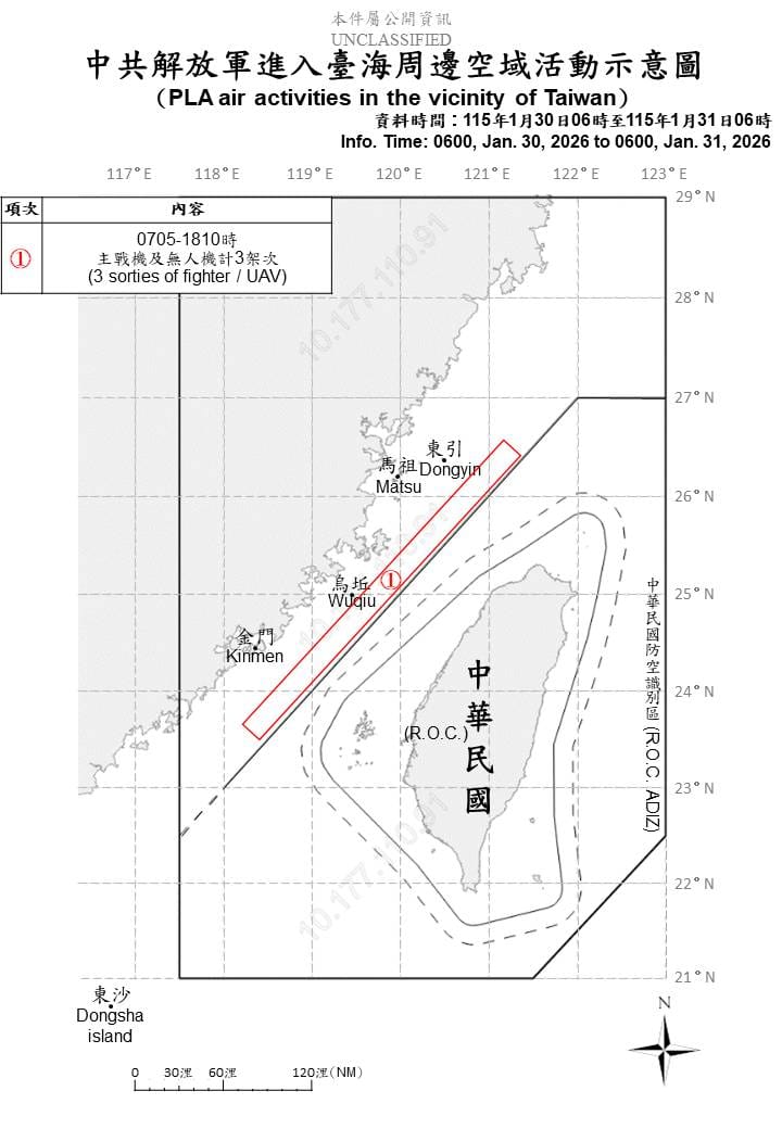 根據國防部今天公布「中共解放軍進入台海周邊空域活動示意圖」,國軍於昨天上午7時5分至昨天晚間6時10分,在台灣海峽空域偵獲中共3架次主戰機及無人機。