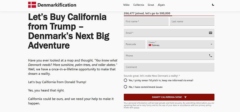 《獨立報》指出,在此背景下,「Denmarkification」請願以幽默方式回應現實政治爭議,並承諾若成功「購買」加州,將把丹麥特有的「hygge」文化帶入好萊塢。網站估算,加州的「售價」為 1 兆美元,並直言不諱地表示,是否考量加州人民的意願並非重點,相關文字同樣帶有強烈諷刺意味。