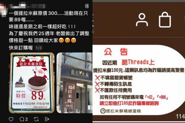 遭詐騙集團利用的提拉米蘇店家,去年9月就曾公告,社群平台上出現大量冒用品牌名義的詐騙廣告,常以「88元」、「89元」、「100元」、「買一送一」等明顯低於市價的價格吸引消費者。今年1月30日再次提醒消費者,詐騙手法仍持續出現。