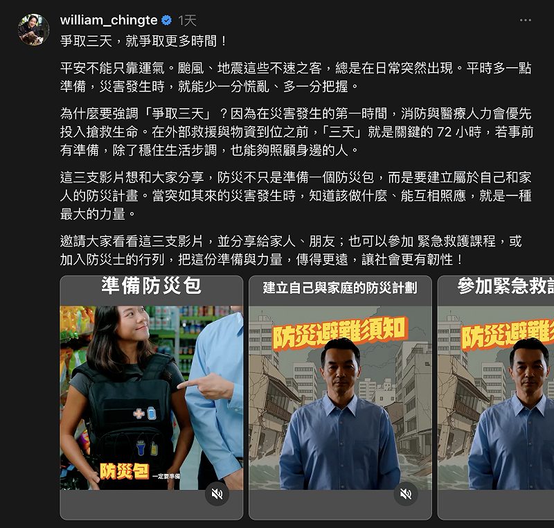 賴清德提到,這3支影片想和大家分享,防災不只是準備一個防災包,而是要建立屬於自己和家人的防災計畫。當突如其來的災害發生時,知道該做什麼、能互相照應,就是一種最大的力量。