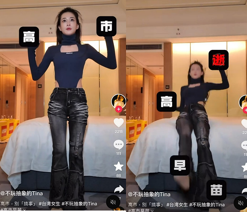 今日有網友在Threads分享一則影片,標題則寫著「高市,別『搞事』」。影片中抖音網紅「不玩抽象的Tina」雙手雙腳,後製出「高市早苗」4個字,接著以中國人口音講出「台灣有事」,緊接著高市早苗的「市」字出現被槍枝瞄準的圖案、後製背景音發出非常響亮的槍聲,「不玩抽象的Tina」順著槍聲往身後的床墊倒下,遭瞄準的「市」則變成代表死亡的「逝」紅字。不過目前該影片已經被撤掉了。