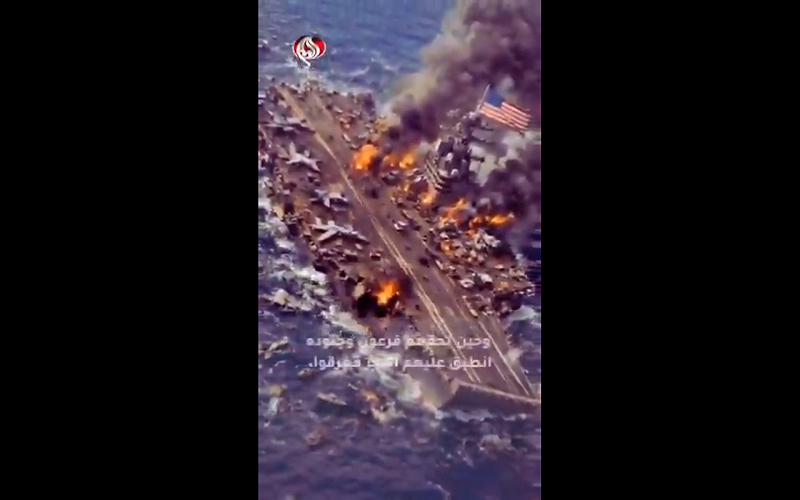 伊朗近日發布多段宣傳影片,內容展示以先進武器系統打擊美國航空母艦與 B-2 轟炸機的模擬畫面。 圖:翻攝自影片