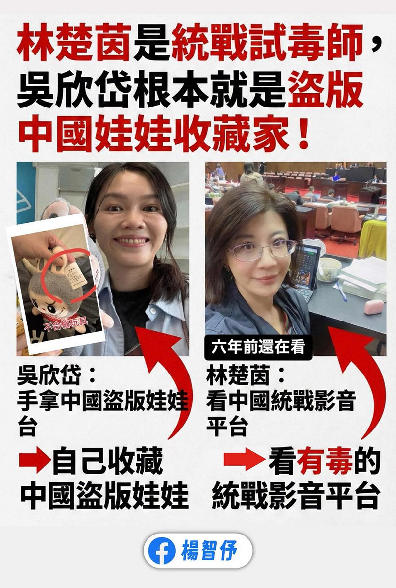 楊智伃表示,吳欣岱和林楚茵兩個人邏輯真的很一致,林楚茵稱本來不知道抖音是中國的統戰工具,吳欣岱稱本來不知道拉布布是中國的統產工具。一個負責試毒,一個負責收藏,這就是綠營的「抗中保台」。
