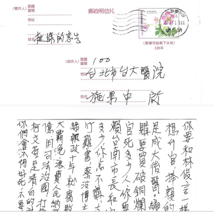 施景中(2)日發文提及,在公務信箱拿到一張充滿恨意、沒有署名的明信片,內文寫著「你想要和林俊言一樣沒格想升官,捧賴(清德)的XX,賴是成大後醫,編1.25兆軍費要買破銅爛鐵,飛官死多少人,你要飛嗎?賴(當)台南市長和官員污多少,你怎不講,真是罄竹難書....柯文哲是清白的、被冤枉的,你們會不得好死,不要臉,想院長位」。