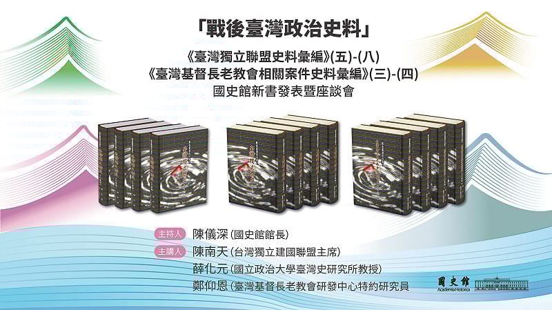 配合書展活動,國史館規劃多場新書發表暨座談會,其中 2 月 4 日(週三)下午 3時30分,將推出「戰後臺灣政治史料」座談,發表《臺灣獨立聯盟史料彙編》(五)-(八) 與《臺灣基督長老教會相關案件史料彙編》(三)-(四)。該場座談由國史館長陳儀深主持,並邀請台獨聯盟主席陳南天、政治大學臺史所教授 薛化元,以及臺灣基督長老教會研發中心特約研究員鄭仰恩共同與談。